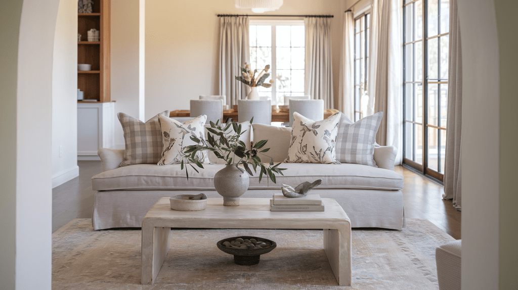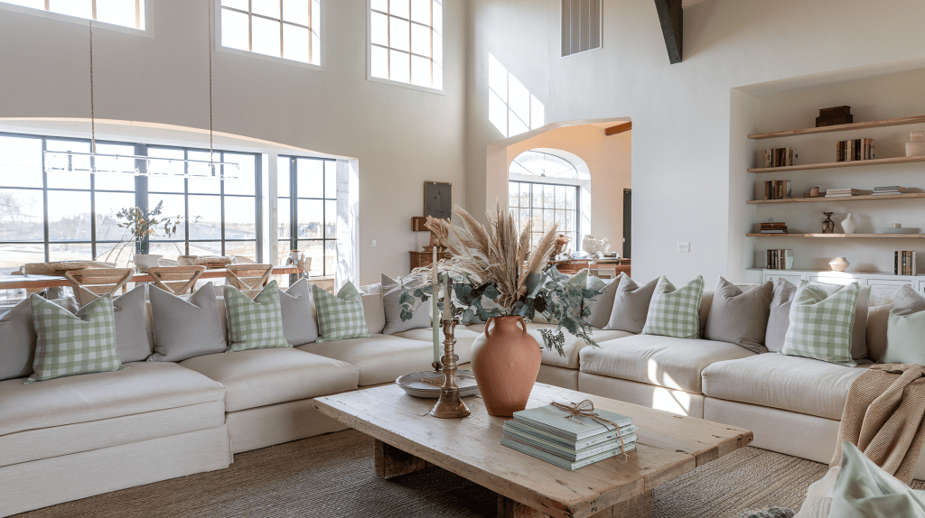 In the living room, modern rustic elegance comes to life through a mix of natural textures and clean, contemporary lines. Start with a neutral sofa in soft linen or cotton, layered with pillows in muted floral block prints or gingham plaid for a mix of comfort and subtle pattern. A reclaimed wood coffee table provides the perfect rustic touch, styled with a ceramic vase filled with dried eucalyptus and a shallow bowl of pinecones for a cozy, seasonal vibe.