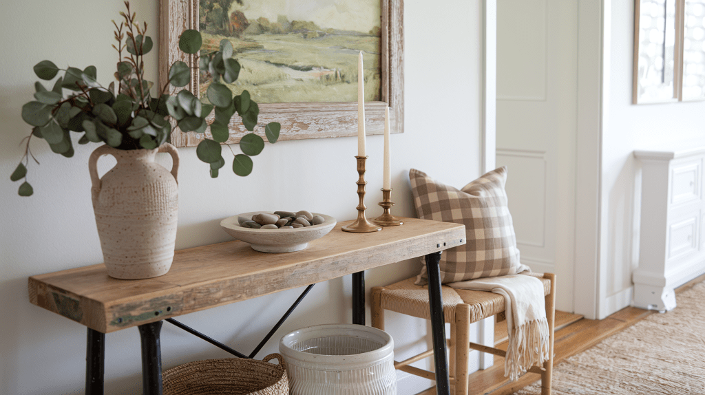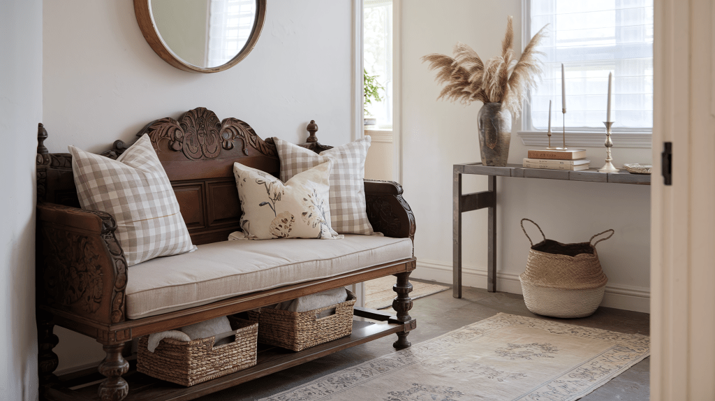 Your entryway is the first thing people see when they enter your home, so it should set the tone for the entire space. Opt for a reclaimed wood bench near the door, layered with neutral cushions and pillows in subtle gingham or floral patterns. A small terracotta pot with a plant or a ceramic vase with greenery adds life and color without overwhelming the space.