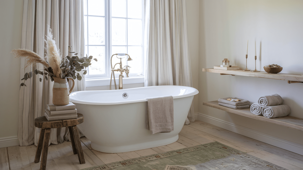 Add warmth to the space with plants or a small terracotta vase holding fresh greenery, and opt for linen shower curtains to keep the vibe soft and airy. This will create a bathroom that feels fresh, natural, and timeless—perfect for unwinding at the end of the day.