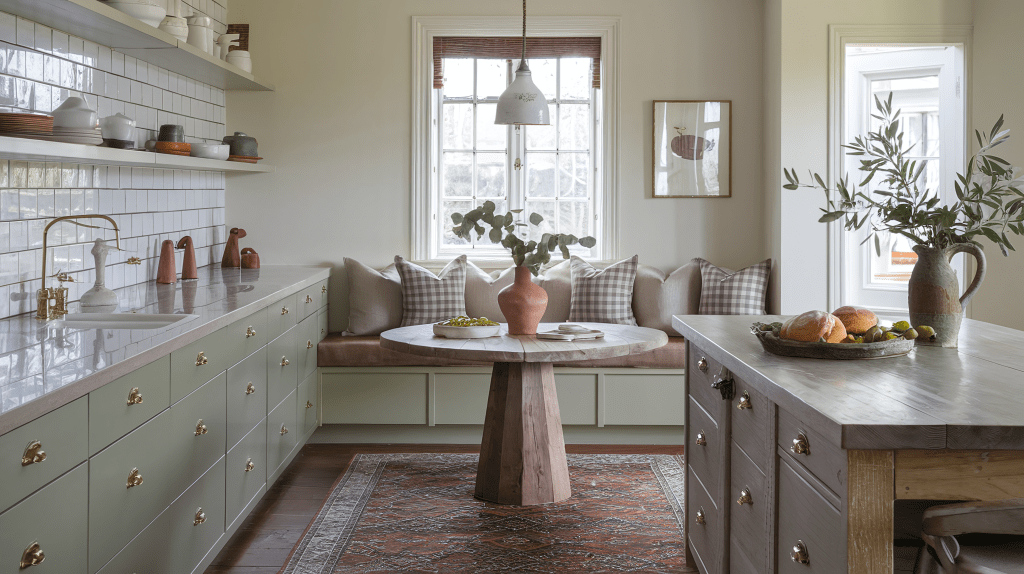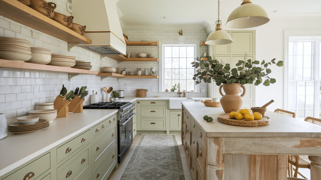 For countertops, natural stone or wood offers the perfect balance of rustic charm and modern style. A simple yet elegant backsplash made from cream subway tiles or muted marble ties the room together. To complete the look, add some greenery to the space with small potted plants or herbs, keeping the vibe fresh and natural.