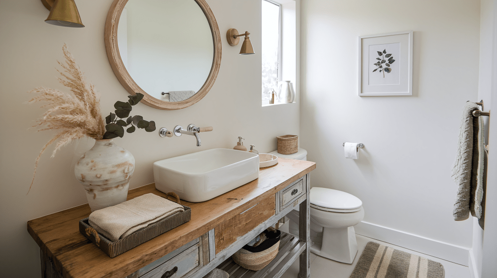 Even in the bathroom, modern rustic elegance can create a soothing and stylish retreat. Consider using reclaimed wood for shelving or a vanity, paired with soft, neutral towels and natural stone accents for the countertop or backsplash. A large, frameless mirror with a wood frame adds rustic elegance, while brass fixtures or ceramic soap dishes bring in a touch of modern sophistication.