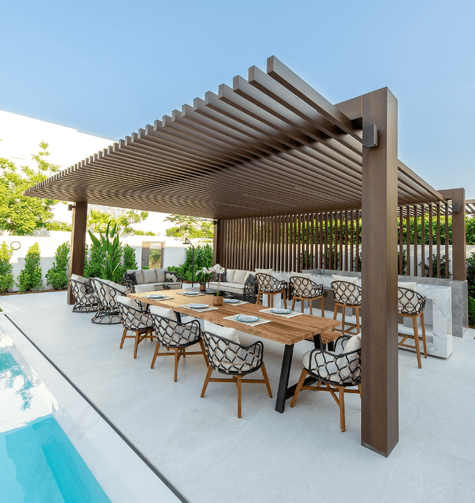 Pergolas manifest in a myriad of shapes and dimensions. In this instance, a gracefully curved pergola mirrors the contours of the pool, offering an idyllic retreat to unwind on a lounger away from the sun’s glare.
