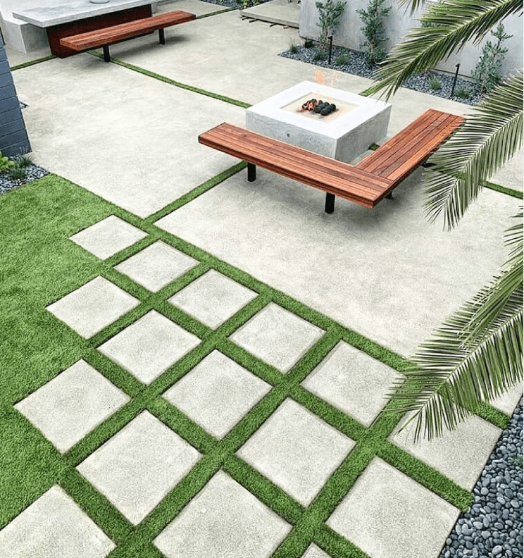 Enhancing your landscape by combining poured concrete with elements like grass and wood can elevate its overall aesthetic.