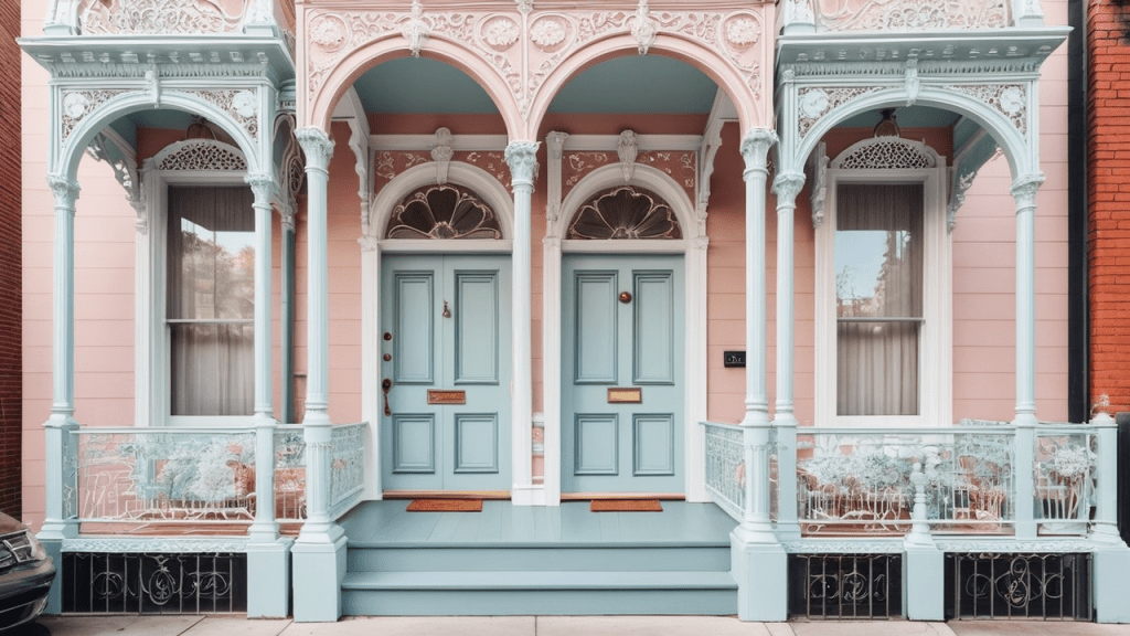 These homes often feature dormer windows, elaborate cornices, and decorative iron cresting. The symmetrical facades and grandiose proportions give these homes a stately appearance, reminiscent of the opulent buildings of Paris.