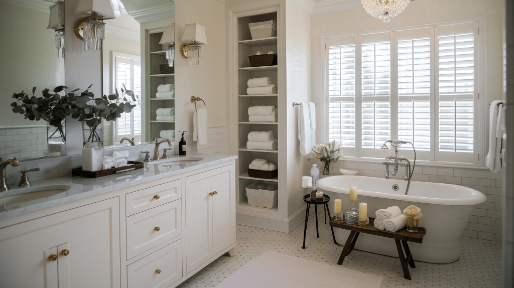 Transform your bathroom into a luxurious retreat with simple yet elegant details. A freestanding tub can serve as the centerpiece, with a small wooden stool nearby holding a candle and a rolled towel.