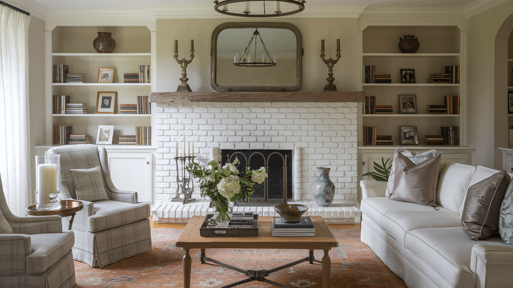 To add visual interest, consider a Persian-style rug in faded blues and grays, tying the space together with warmth and charm. Built-in bookshelves or a vintage sideboard can showcase a mix of curated books and decor, adding personality to the space.