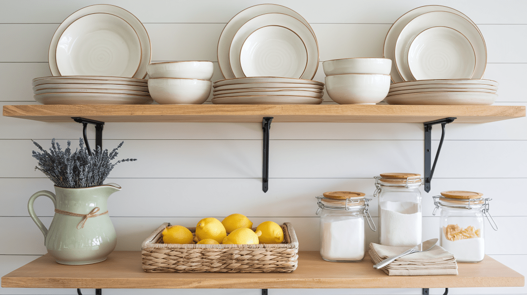 Kitchens are the hub of the home, and they deserve just as much attention to detail. White Shaker-style cabinets paired with brass hardware create a classic look. Open shelving can display stacks of white dishes, ceramic pitchers, and glass jars filled with pantry staples.