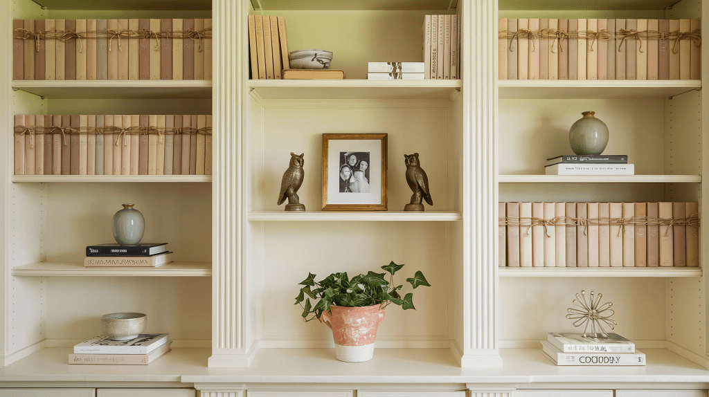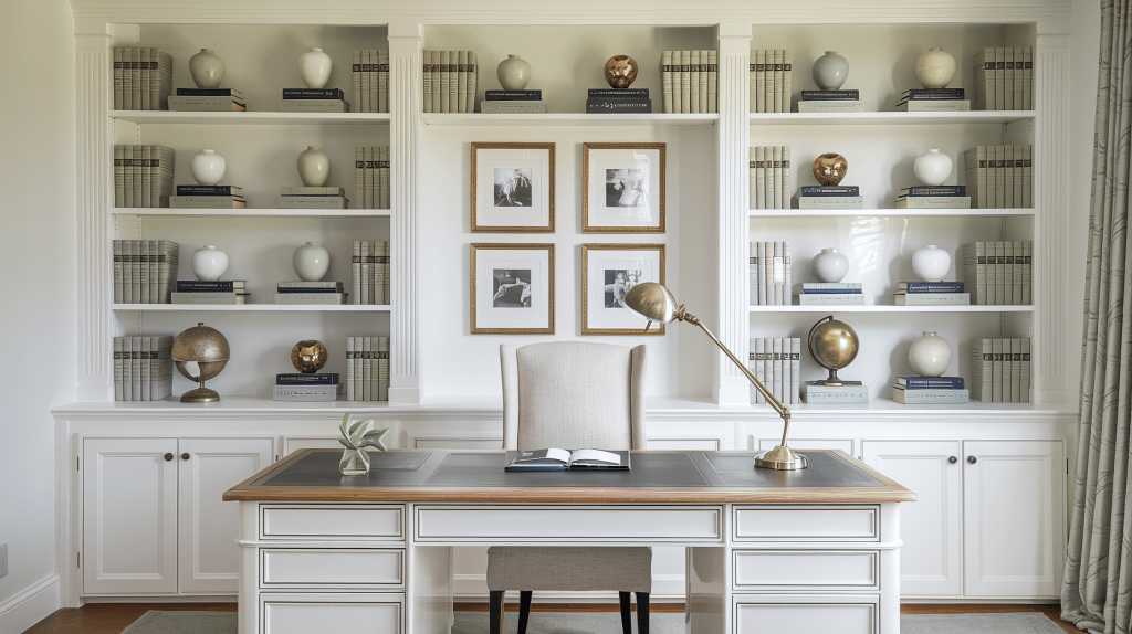On built-in shelves or a nearby bookcase, display books, framed photos, and decorative objects for a personal touch. Keep the color palette neutral to create a calm, focused atmosphere.