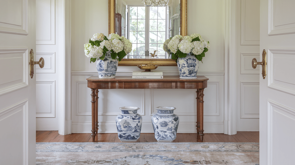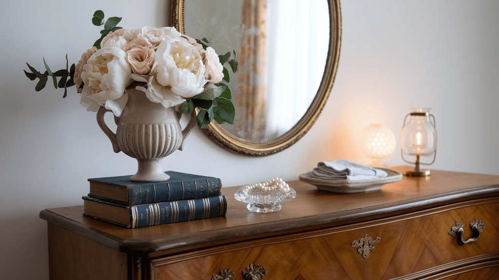 The entryway sets the tone for your home. A vintage console table with turned legs can be styled with a round mirror, a small lamp, and a vase filled with greenery. Beneath the table, a woven basket can hold folded throws or shoes, blending practicality with charm.