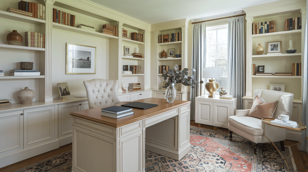 A home office should combine productivity with comfort. A vintage desk with a natural wood finish can be paired with an upholstered chair for an inviting workspace. Style the desk with a brass lamp, a stack of notebooks, and a small plant.