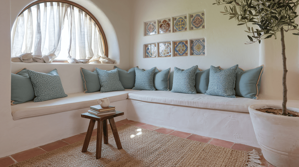 Even the smallest corners can evoke Mediterranean charm. A reading nook with a built-in stucco bench, striped cushions, and a mosaic-topped side table creates a cozy retreat.