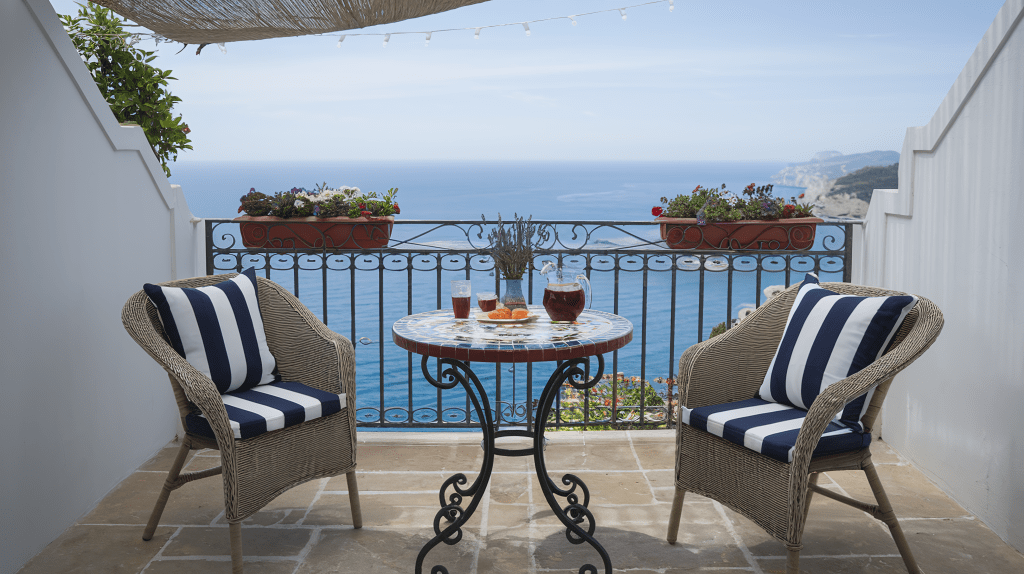 For a smaller outdoor space, try a balcony overlooking the sea. A mosaic bistro table and wrought iron chairs, paired with a potted olive tree and colorful flowers, create a peaceful retreat. These outdoor spaces are as functional as they are beautiful, offering a seamless connection between nature and design.