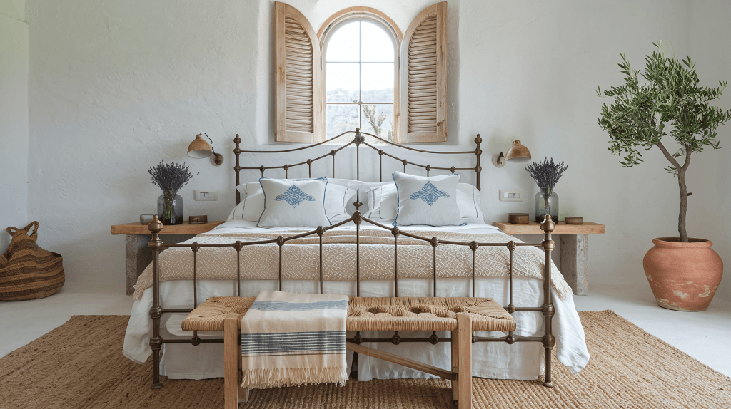 Mediterranean bedrooms are designed to be tranquil retreats, with a focus on layered textures and natural materials. A wrought iron bed frame dressed in crisp white linens and a light blue quilt creates a serene palette. Walls are anything but plain, often featuring niches filled with ceramics or a gallery of hand-painted tiles for visual interest.