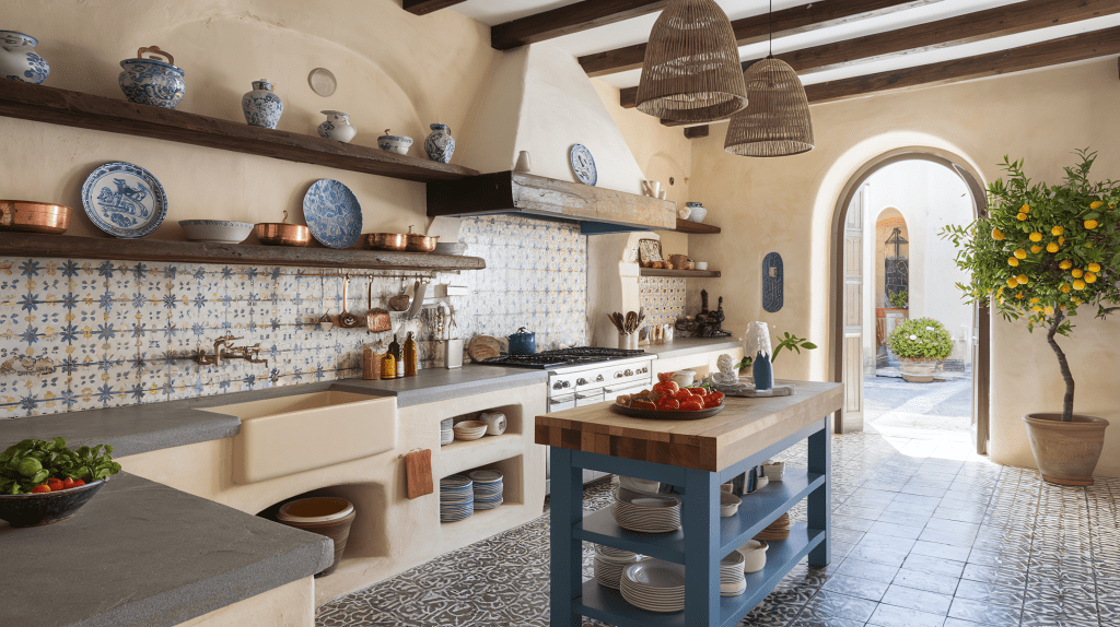 Mediterranean kitchens are a feast for the senses, blending functionality with artistry. A backsplash of hand-painted tiles in blue, yellow, and white adds a pop of color and serves as a focal point. Wooden shelves can display ceramic dishes, copper pots, and glass jars filled with dried herbs.