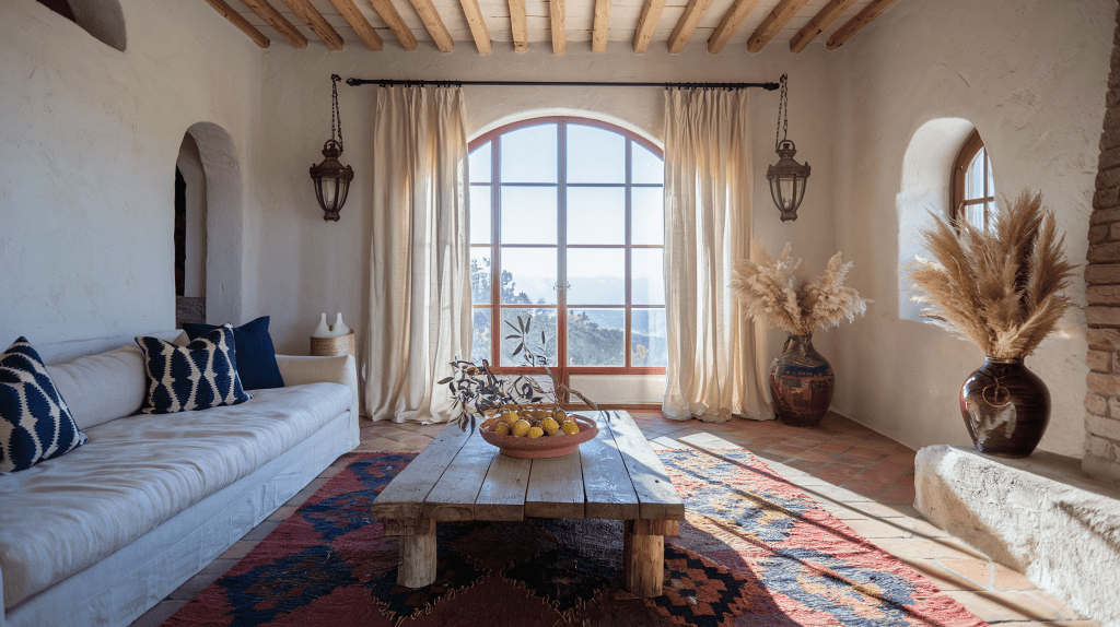 Once inside, Mediterranean living rooms exude warmth and relaxation. Think textured stucco walls, exposed wooden beams, and terracotta tiles underfoot. A linen sofa in soft beige or white can be accented with cushions in bold terracotta, navy, or mustard tones. Add a rustic wooden coffee table styled with a ceramic vase filled with olive branches for an authentic touch.
