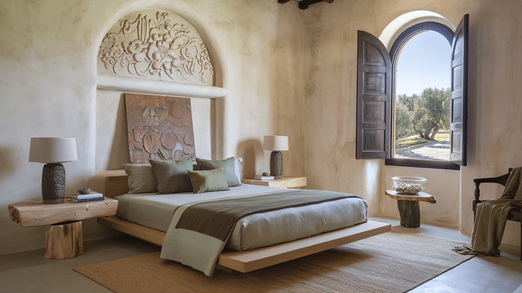 To complete the look, add a rustic wooden bench at the foot of the bed, styled with a woven throw and a potted lavender plant. These thoughtful details create a space that feels both calming and luxurious.