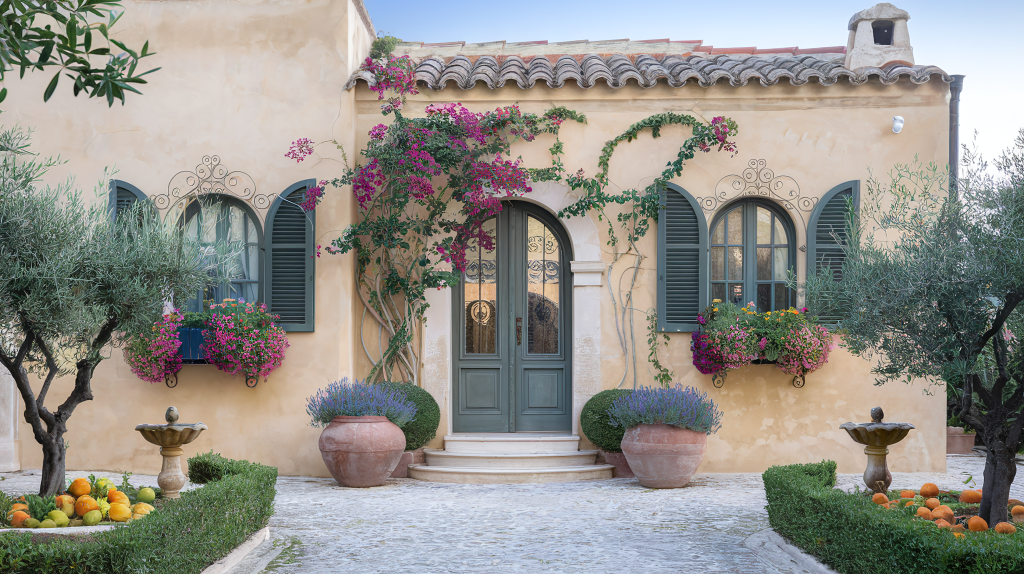 The exteriors of Mediterranean homes are defined by their earthy tones, vibrant accents, and timeless elegance. Picture a villa perched on a hillside, its creamy stucco walls glowing in the sunlight, complemented by a terracotta-tiled roof. Arched windows with colorful shutters frame breathtaking views of the ocean, while bougainvillea cascades over the walls in vibrant magenta.