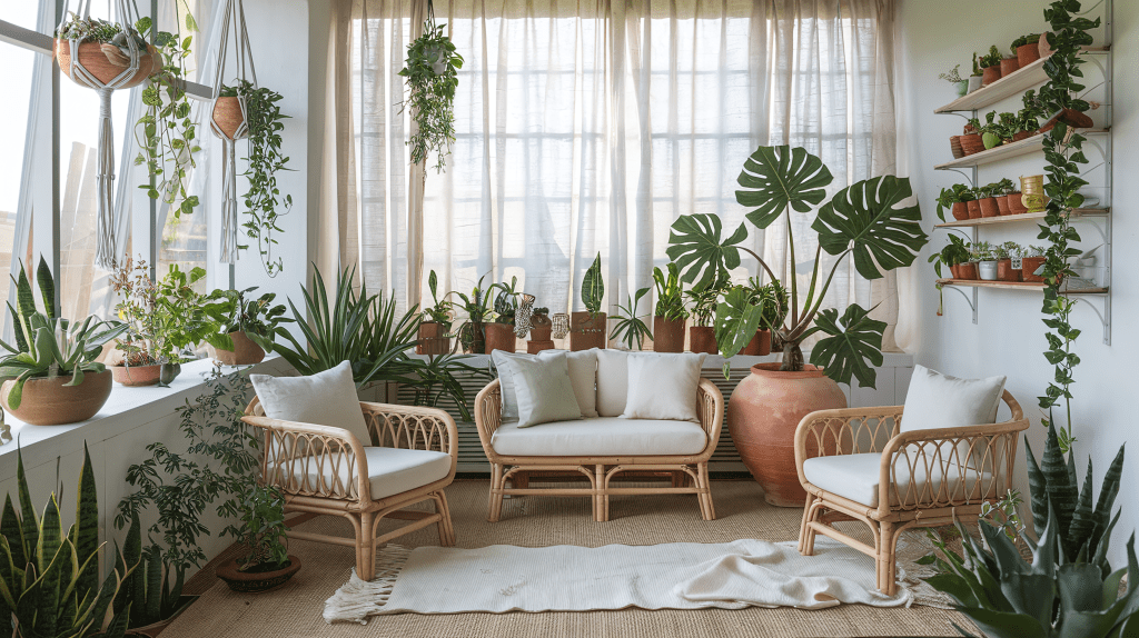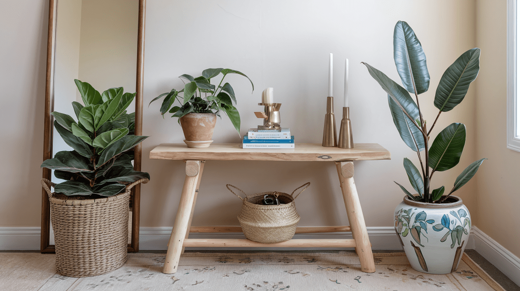 Placing a tall rubber plant or bird of paradise in a handwoven basket adds height, while a plant stand with cascading pothos or ivy softens the space. Accent the area with a textured rug or cozy armchair for an inviting, lived-in feel.