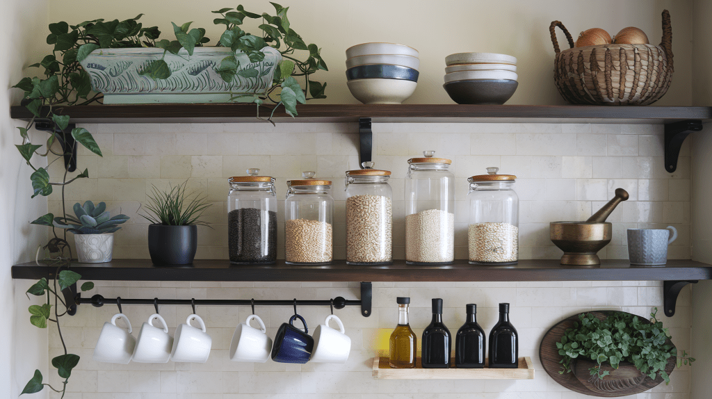 Open shelving provides the perfect opportunity to showcase a mix of plants alongside books, vases, and kitchen essentials. A combination of trailing plants, like ivy or pothos, and structured greenery, such as a snake plant or philodendron, keeps the display balanced.