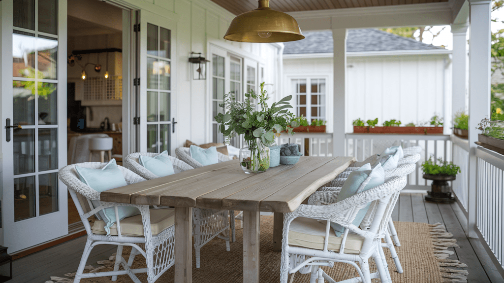 Along the porch railing, potted ornamental grasses sway in the breeze, enhancing the relaxed coastal atmosphere. A woven outdoor rug ties the seating area together, while string lights draped overhead create a cozy glow as the sun sets over the horizon.