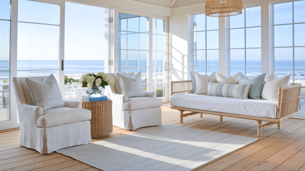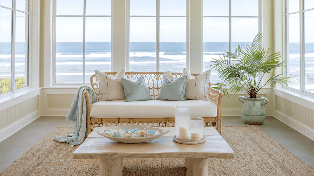A light-filled coastal sunroom offers the perfect space to relax while enjoying panoramic ocean views. A natural wicker daybed topped with soft white cushions and pale blue throw pillows invites lounging, while a lightweight cotton blanket is draped over one arm for chilly mornings.