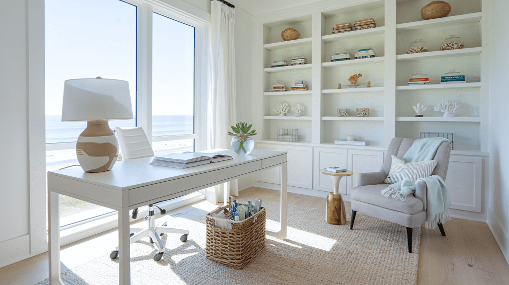 Above the desk, floating wooden shelves hold nautical decor, framed artwork, and small ceramic vessels filled with sea glass. A slipcovered armchair in neutral linen provides a cozy place to sit, and a woven jute rug grounds the space.