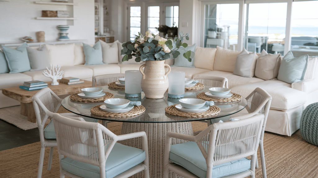 The coastal dining room is both elegant and casual, featuring a weathered wicker table surrounded by white slipcovered chairs. The table is styled with a simple linen runner, a large glass hurricane candle, and a ceramic bowl filled with smooth beach stones.